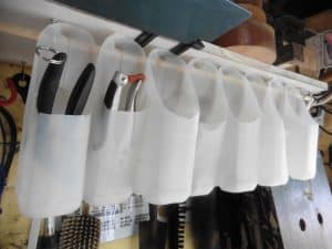 I made a couple of new racks to support some more recycled cassette boxes today, and invented a new hanging set of recycled milk bottles, ideal for things such as secateurs.